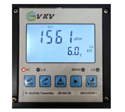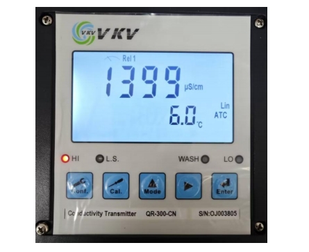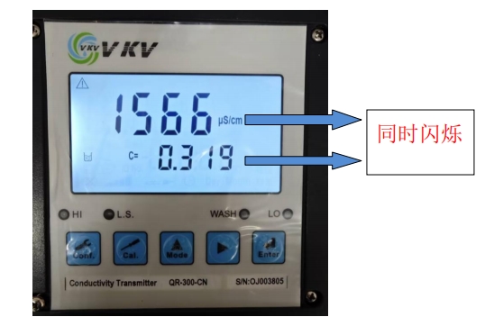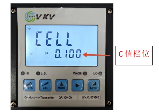 5. 根據(jù)電極線標(biāo)號(hào) C 的數(shù)值選擇與之最接近的檔位電導(dǎo)預(yù)設(shè)值:0.0100、0.100、0.500、10.00(例如電極標(biāo)號(hào)數(shù)值 C=0.3188,則選擇C=0.500 檔位)通過▲ 或 ? 鍵來變更檔位。