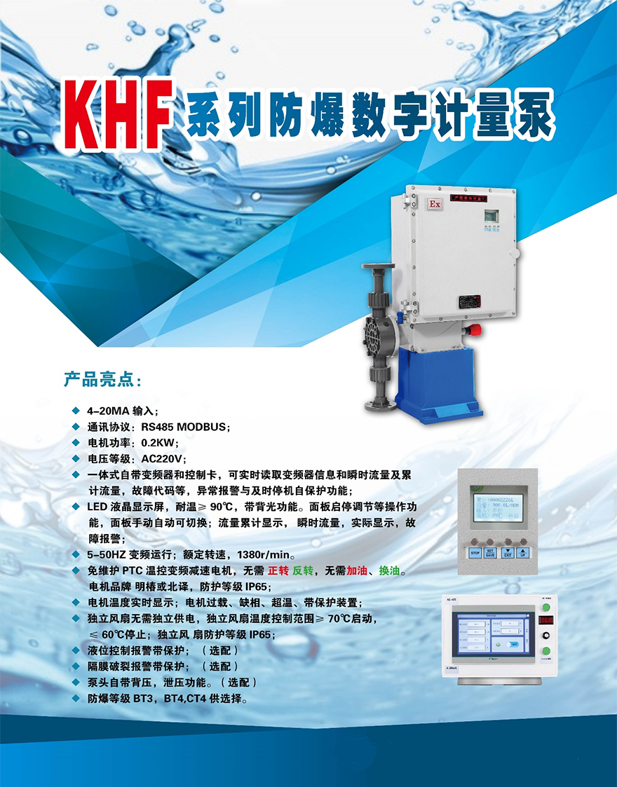 自主研發的的智能型KHF系列數字計量泵,為客戶提供化學品精確投加智能化解決方案。數字計量泵機械結構簡單,安裝維護方便,獨特的驅動設計,使得流量控制簡單又精確。泵融合多種智能設計于一身,結合流量、液位、壓力、時間等方面予以控制,通過集成的微處理器予以自動化運算和反饋,友好的按鍵式人機界面系統讓操作更便利化。